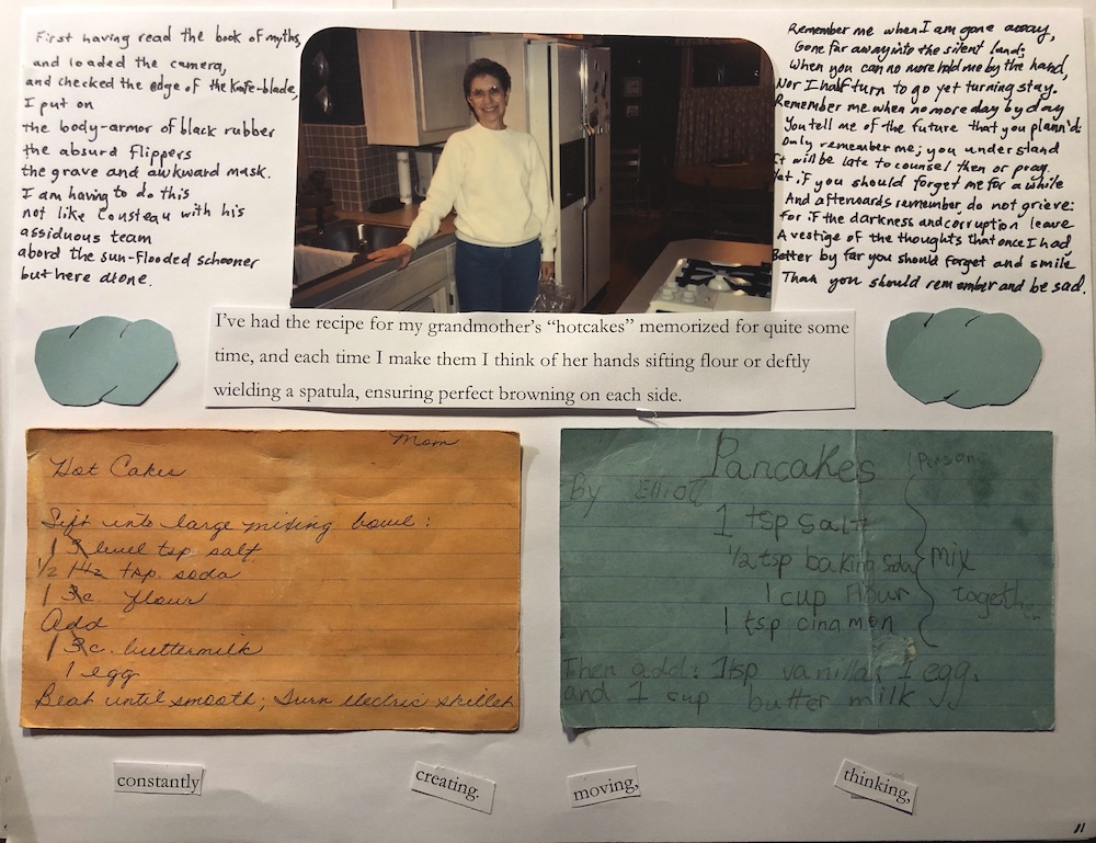 Elliott Yoakum created an homage to his relationship with his grandmother through her pancake recipe and images, clippings, and writings from her life. See the full story here.