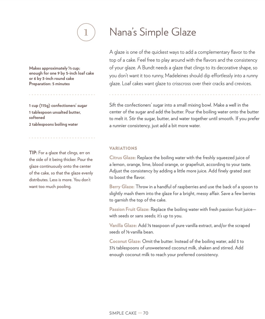 "Funnily enough, this recipe is named after my Mom, who no doubt learned it from her mom. It was so damn hot in Australia most of the year that most cakes didn’t get iced. Frosting would have melted minutes after decorating. So I think a simple glaze became the Australian way for icing cake. It was also very economical and simple. I think the Australians took their culinary cues in my Nan’s era from the British. So a modest baked treat for morning or afternoon tea to have with a cuppa was a sign of being well heeled. And remember, there wasn’t the snack food culture. You had to cook what you ate. Everyone loves this glaze. I mean, how can you go wrong, warm cake and clinging glaze."