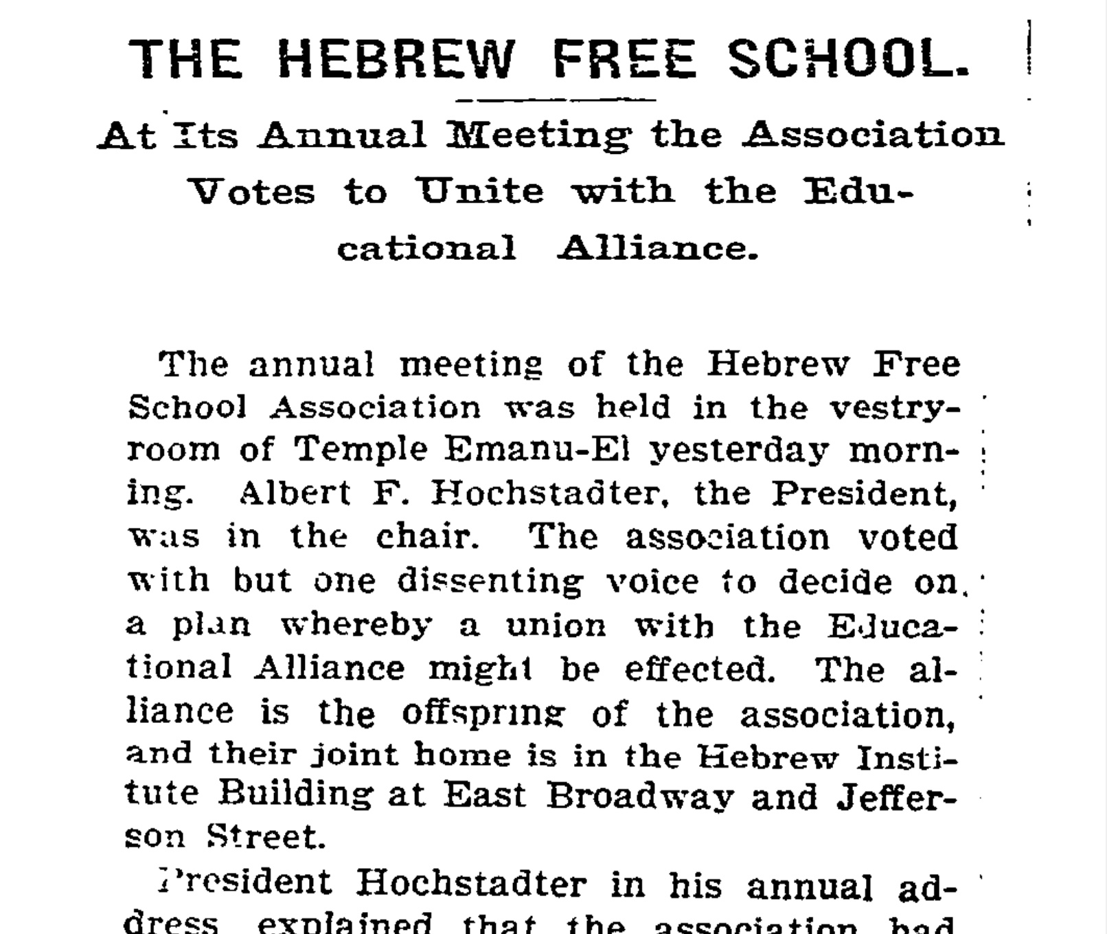 My great-great-grandfather, Albert Hockstader, was, at one point in the late 1890s, the president of the Hebrew Free School Association. I discovered this while reading a New York Times article from December 27, 1898, reporting on a meeting between the HFSA and the Educational Alliance that took place at Temple Emanu-El in New York. At this meeting, the two entities voted on whether to join forces. A few names I knew came to life: Jacob Schiff (Wall Street), Isidor Straus (Macy’s), Theresa Wallach (charitable work), and others were all in the room that day. Mostly, I felt a strange disconnect. Here was a mundane event that happened more than a hundred years ago, and I’m reading about it and realizing, I’m related to these people.