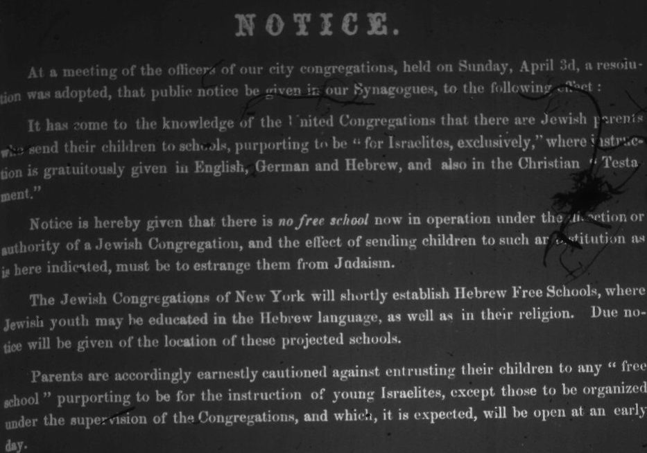A number of the earliest synagogues in New York came together and drafted a letter to residents, urging them not to join public schools whose aim was to “estrange them from Judaism,” but to join the Hebrew Free Schools newly formed by the Jewish Congregations of New York instead.
