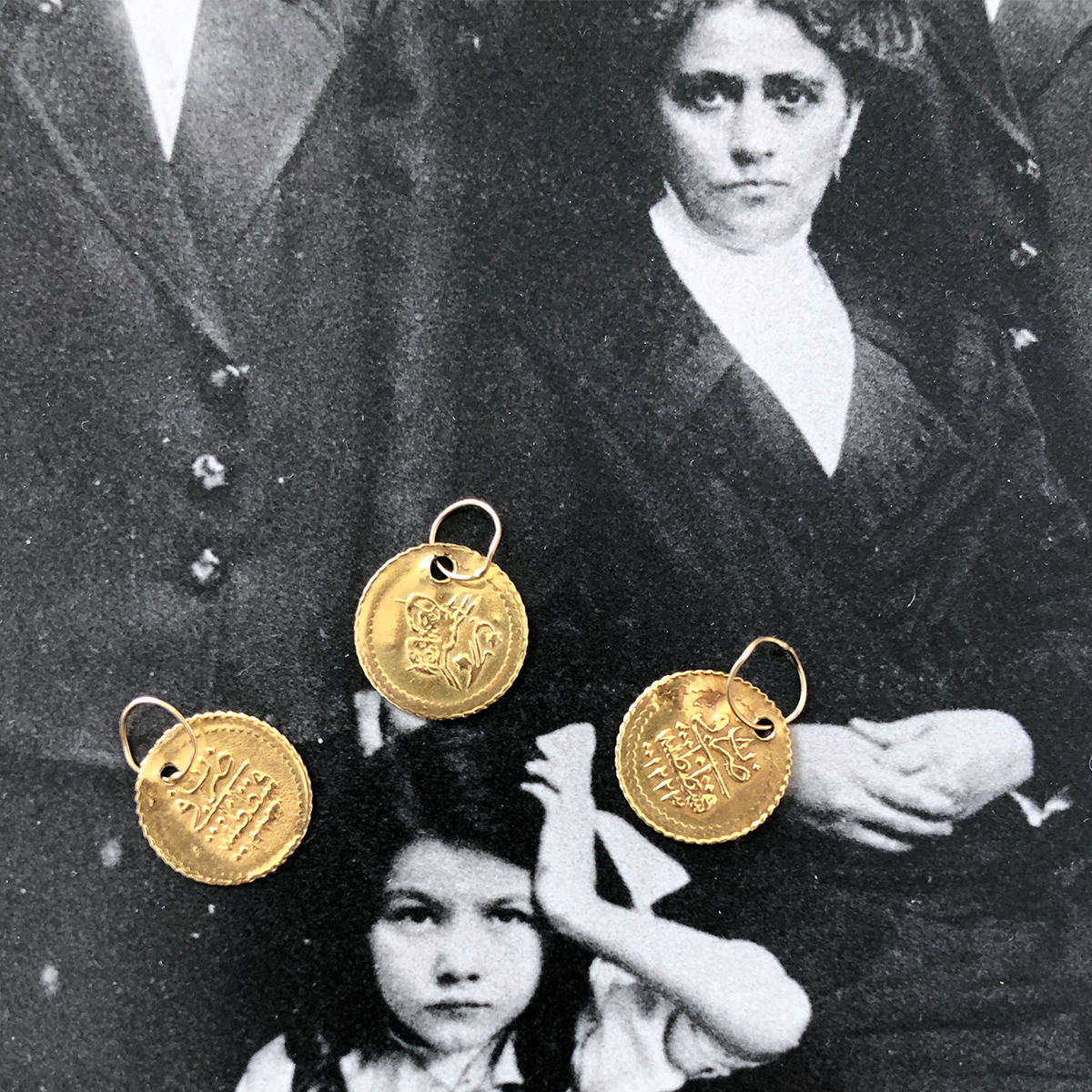 Ottoman Empire coins. My grandmother, Lucy Armaganian (the girl in this photo), was an Armenian refugee who fled Smyrna, Turkey (now called Izmir) after the Great Fire in 1922. She landed in New York Harbor at age 14, wearing as many layers of clothes as she possibly could so they wouldn’t be taken away, and with these little Ottoman Empire coins hidden between her toes. I am the keeper of the coins now. They live on a long chain hanging on my bedroom wall.—Keirsten Geise