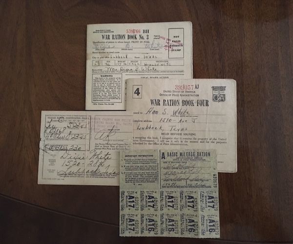 World War II Ration Stamps. These Ration Stamp Books issued by the War Price and Rationing Board were obtained in Lubbock, Texas. The Stamps covered the purchase of such things as gas, sugar, tires, and shoes. When an item purchased was rationed, the stamp had to be presented. The Stamps couldn’t be traded—they had to come out of your assigned book. If you needed a rationed item, you made sure to have the Book when shopping. Everyone just accepted the Ration Stamp process and routine as simply something that had to be done.—Ann White and her daughter, Judy Hudson