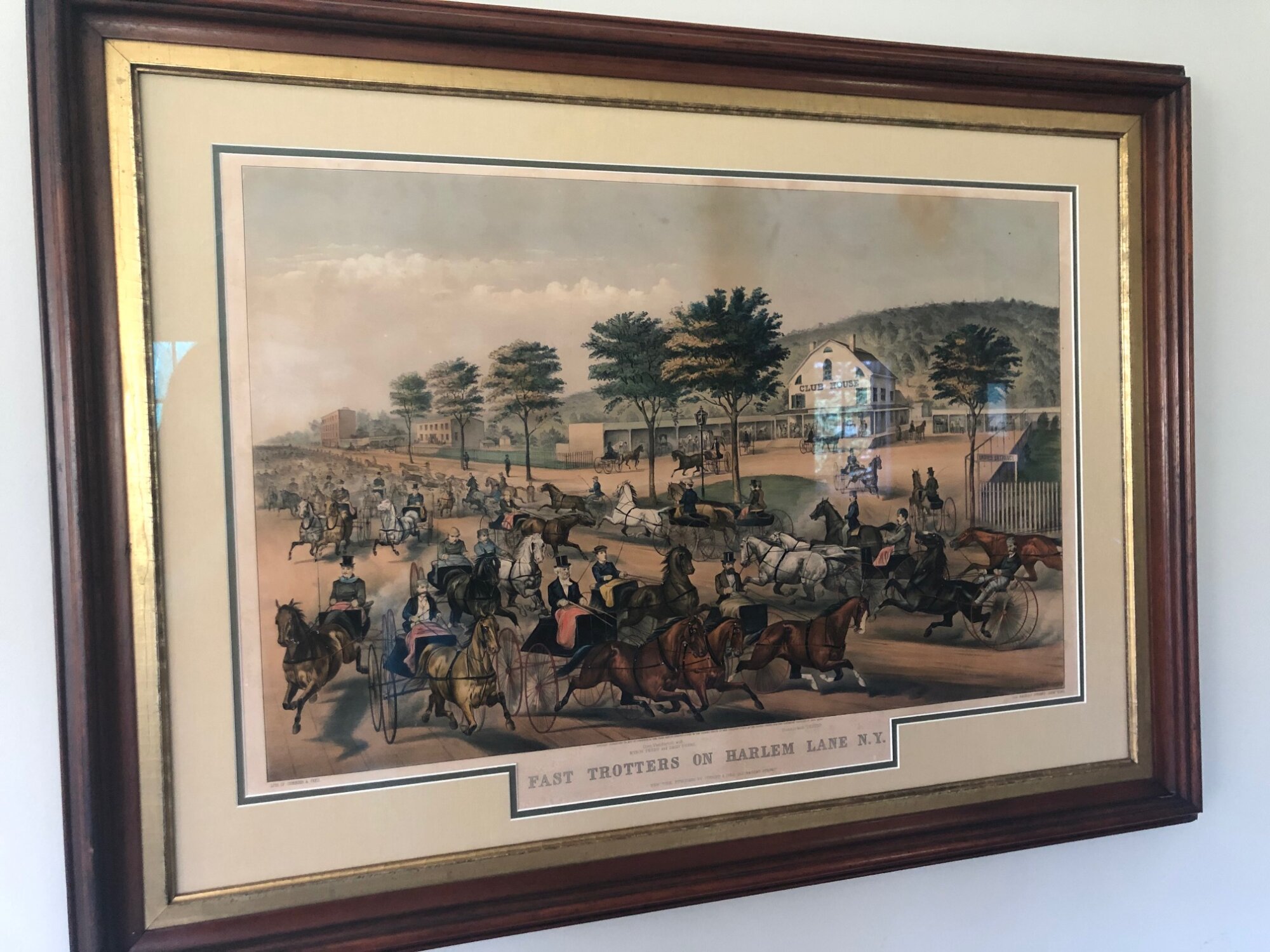 On one particular trip in 1870, my great-great-grandfather Ed Slote purchased this painting, “Fast Trotters on Harlem Lane,” at the train station for 50 cents. The painting is a hand-colored lithograph by John Cameron for Currier and Ives. The Harlem Speedway in the picture still exists at 155th Street in Manhattan. In the painting, Commander Cornelius Vanderbilt, the famous railroad magnate, trots past the clubhouse.