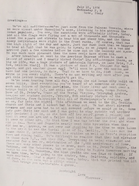 Letter from Florence Carey to her family back home in Ohio. My great aunt travelled from Ohio to New York City and on to Europe in 1936. I have some of her typed letters from that journey: "Chris and I went down and got passes for the stock exchange. Why—If you could see the running and signaling and ticker tape, you’d think you were in a regular nut farm!” Florence and her traveling companions sailed from New York with their Plymouth convertible, aka “Pilly,” over to England, and from there they drove around Europe, ending up in Germany at the Olympics. They also drove through a town where Hitler was stopped, and heard Mussolini speak on the day the sanctions were lifted.—Lauren McFarland