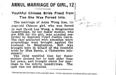 Then I looked at the next page in the stack of printouts. “Annul Marriage of Girl, 12: Youthful Chinese Bride Freed From Ties She Was Forced Into.” The New York Times, Nov. 13, 1920.